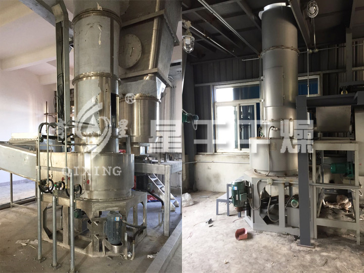 閃蒸干燥機主要由進風系統、加熱系統、加料系統、干燥主機、收料除塵系統、排風系統、控制系統等組成。工作時,濕物料由螺旋加料器進入干燥室,物料在干燥室中與高速旋轉的熱風相遇,細粉狀物料被熱風帶著向干燥室上端移動,不能帶走的物料落在干燥室底部,被底部的粉碎裝置打碎,物料被迅速分散,物料與熱風的接觸面積迅速增大。在離心力的作用下(頂部有分級裝置),達到干燥程度和一定細度的產品被吹出分級裝置,物料在此過程中得到快速干燥。